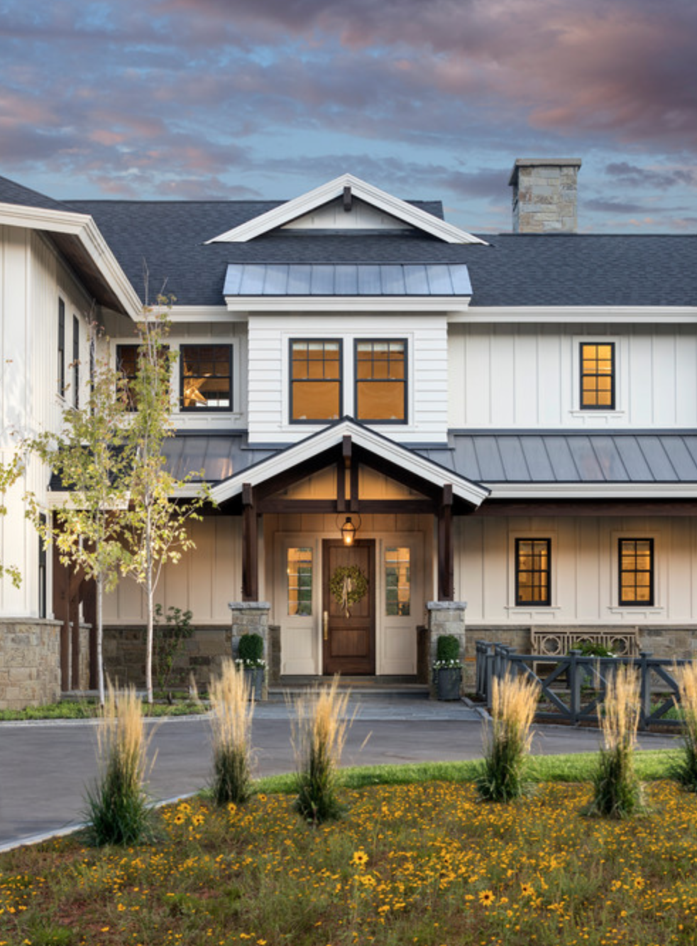 This modern farmhouse in Utah drew me in from the moment I laid eyes on the front door. I didn't realize the grand scale of this home until I began scrolling through the photos. It is so unique and they didn't skimp on any details. Each room has woodworks, molding, fabulous lighting and some kind of beautiful detail. The portico, the colors, the door, the outdoor lighting, the metal roof and the landscaping is beautiful. Photo by Jackson and LeRoy - Browse farmhouse exterior home ideas This property is grand and amazing. Photo by Jackson and LeRoy - Look