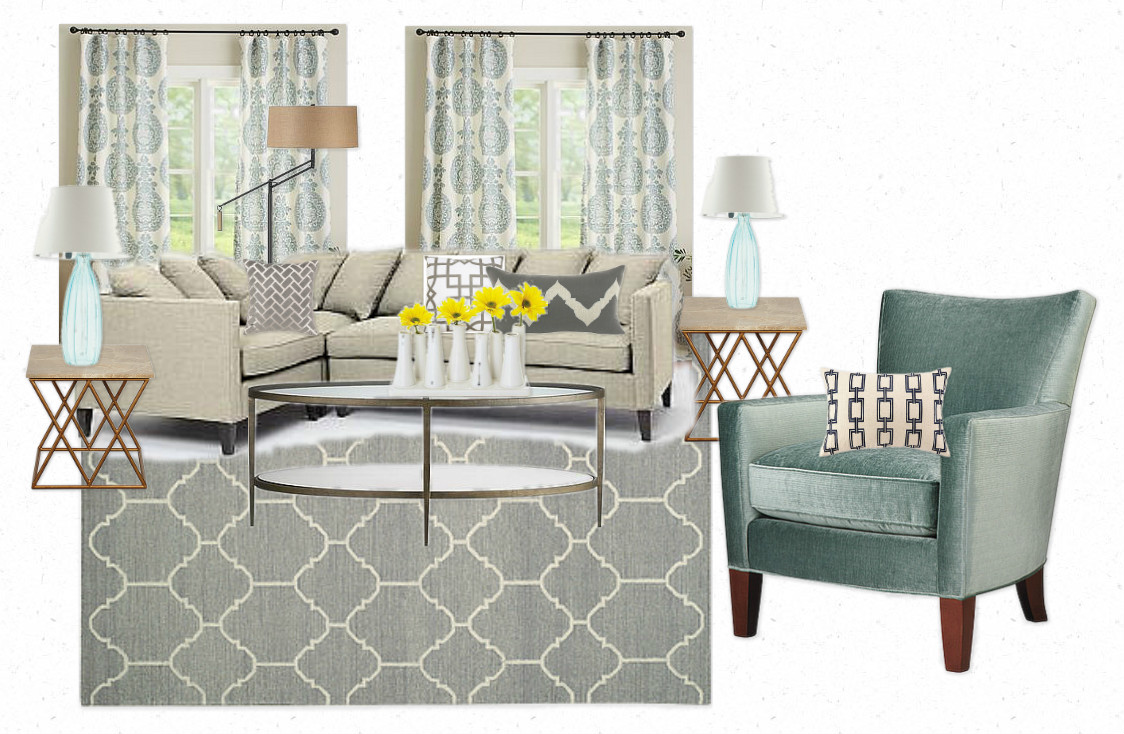 - The color of the chair is very coastal and looks so soothing. I love the blue lamps with the gray rug and the white curtains with the gray print… it ties into our coastal colors and really gives this room a light and airy feel.