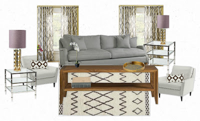 - I kept this room a little neutral with a gray sofa, neutral chairs and white rug with a black print. The colors and patterns on the curtains tied it all together.
