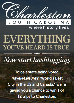 Heck, I didn’t make it up; we just won Travel+Leisure’s, “World’s Best City in the U.S. & Canada.” Which, by the way, there’s a really cool contest going on right now with a chance to win a trip to Charleston and stay in one of our fine hotels. Umm… Charleston Place? Yes, please! Here are the details.