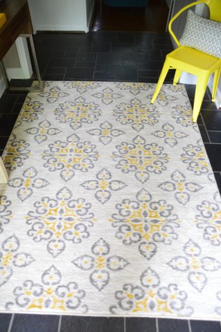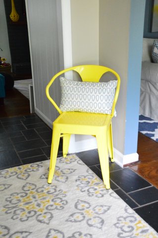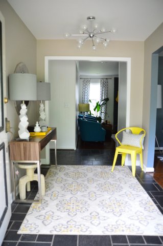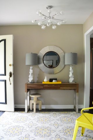 On to the rest of the room! Their entrance color is a warmer grey, which is extremely versatile, so I had a lot of options to play with. You can also see into the den from the entry, and we had already placed peacock blue chairs in that space, so I wanted to play off the blue as well as the pops of yellow found in that room and the formal den to the right.