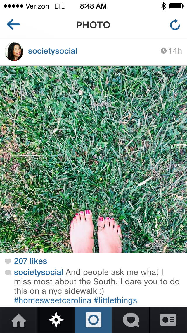 This may sound simple and silly, but I miss walking around barefoot. If you did that on a NYC side walk, your feet would probably decay and fall off!!