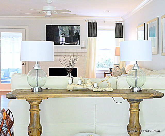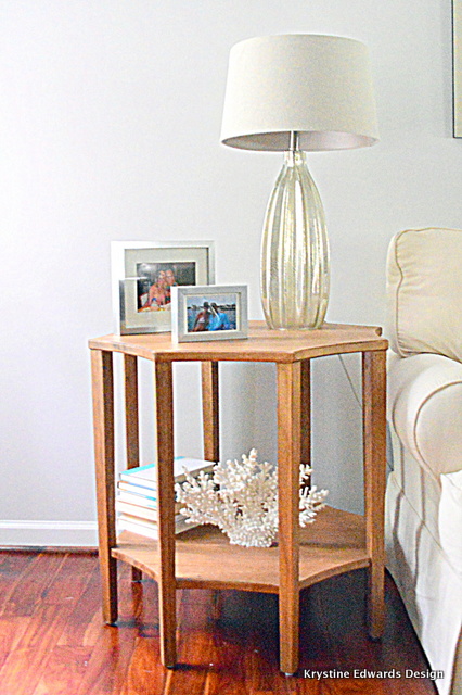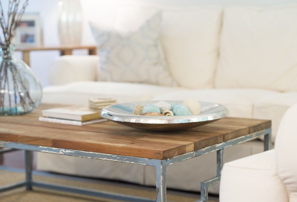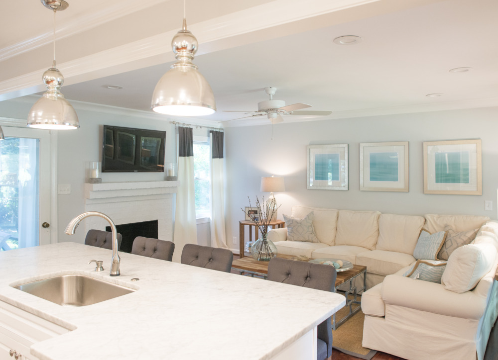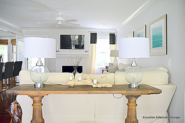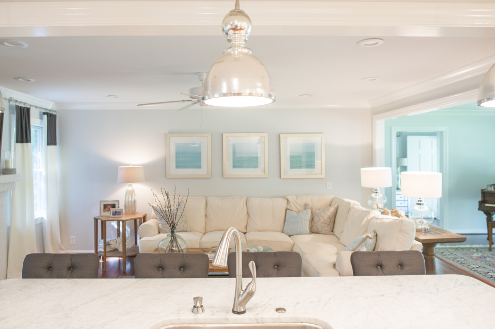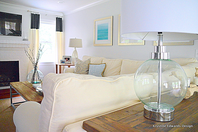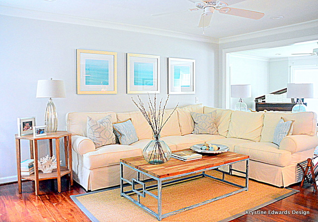 This was my second formal project, and my client wanted coastal, light, white, blues and some of my additional ideas that centered around calm and fresh. I chose a sectional for the space to allow for more cozy and intimate seating. The art I felt needed to be serene, the lighting soft, the tables a little more rough and the rest just pretty. This is what we ended up with:
