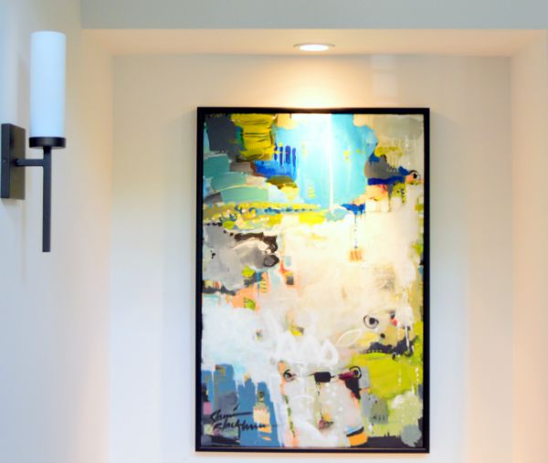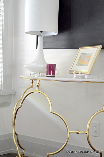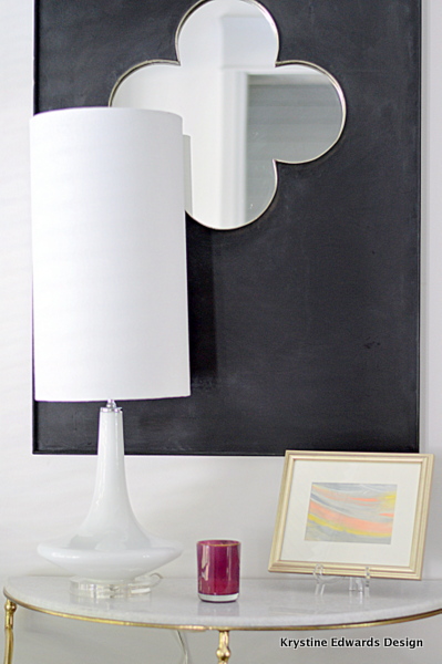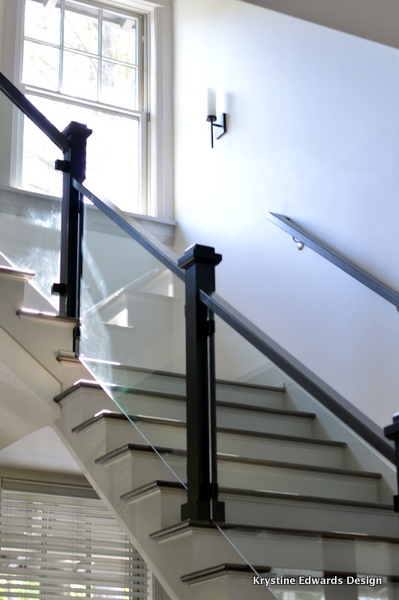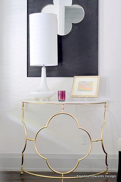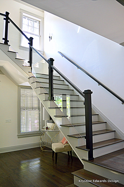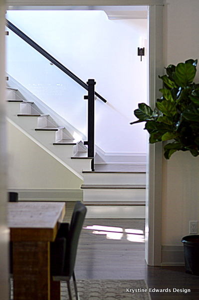 This new construction project meant I could help with the floors, wall colors, details… everything!!! My clients were amazing because they put a lot of faith in me and allowed me to run with my imagination. One of my favorite design choices in this home is the glass railing. Looking up the detail of the woodwork is stunning and the contrast of the stained wood really makes a statement. As you enter the foyer under the stairs is an open space. We added a quatrefoil mirror and quatrefoil table. See the dining room that sits just to the right of this amazing foyer.
