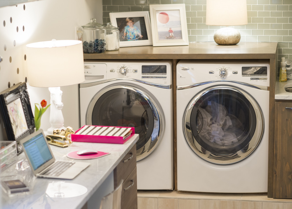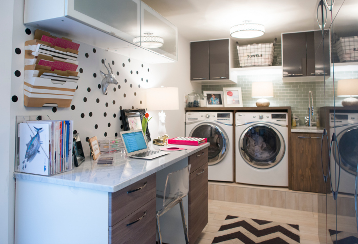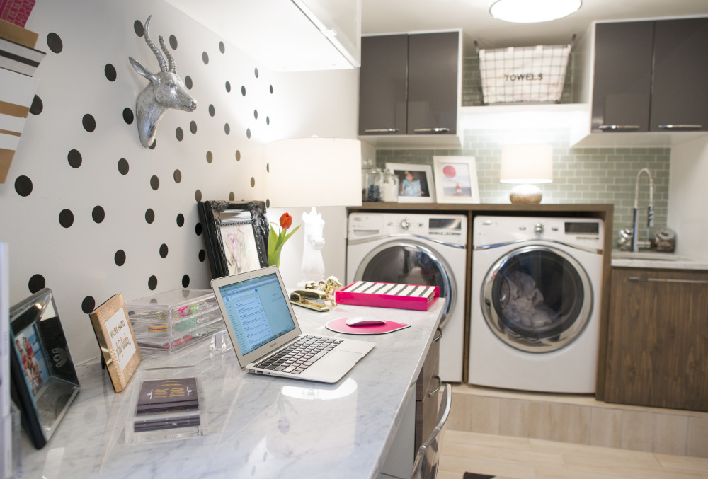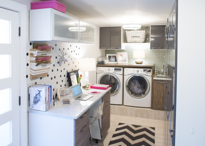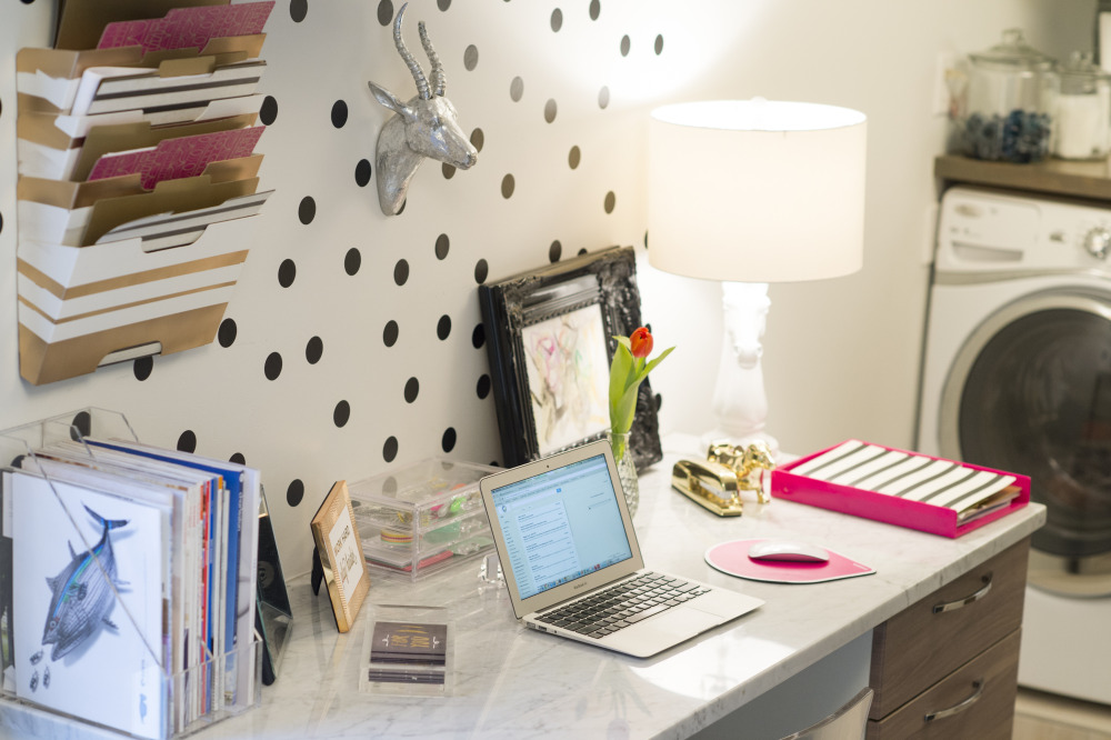 We renovated this space in our brick ranch fairly soon after moving in. We created a highly functional room – enter from the garage or back door – with an office and laundry area. I added a bit of fun flair making it more inviting and comfortable for all of my working!