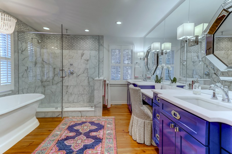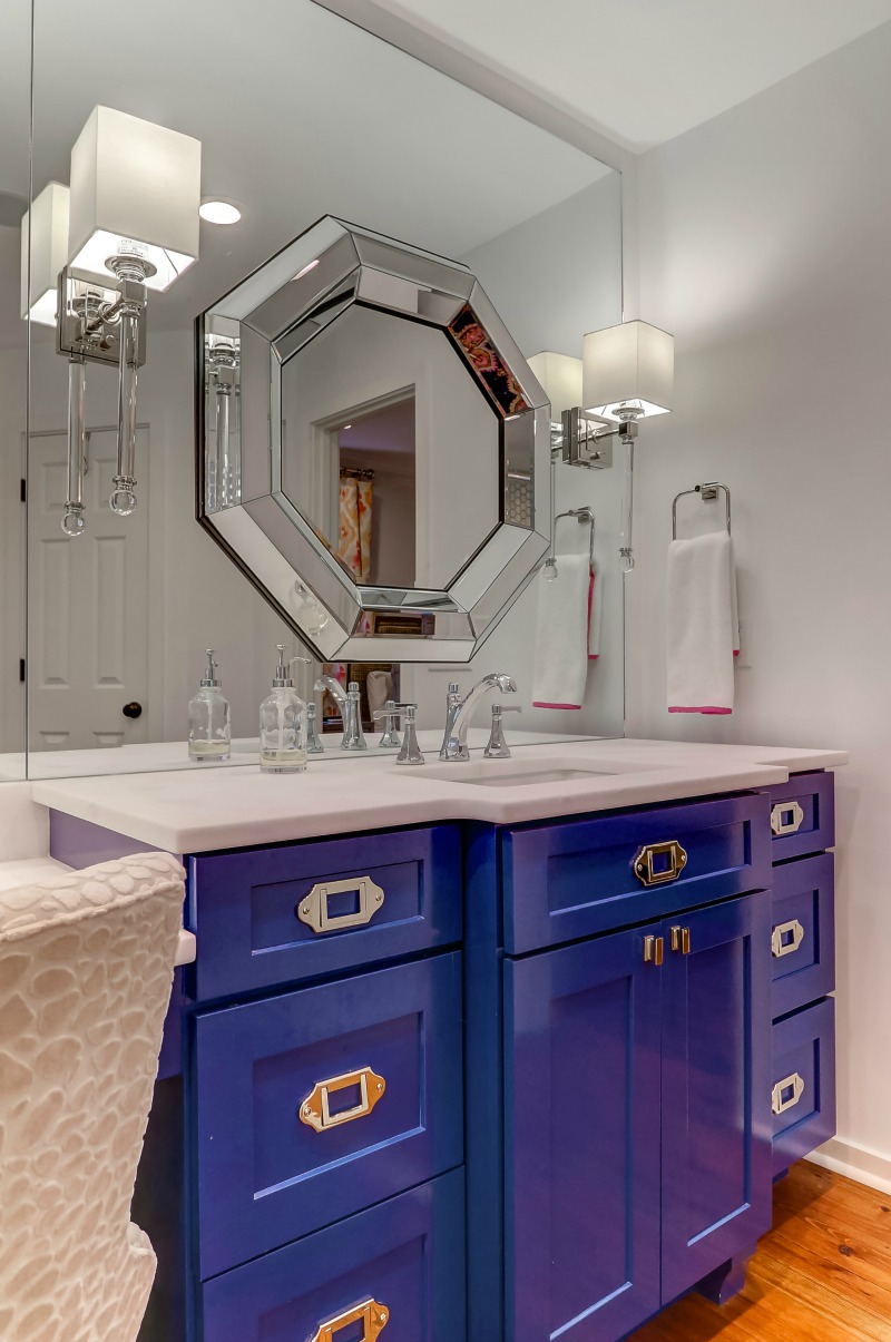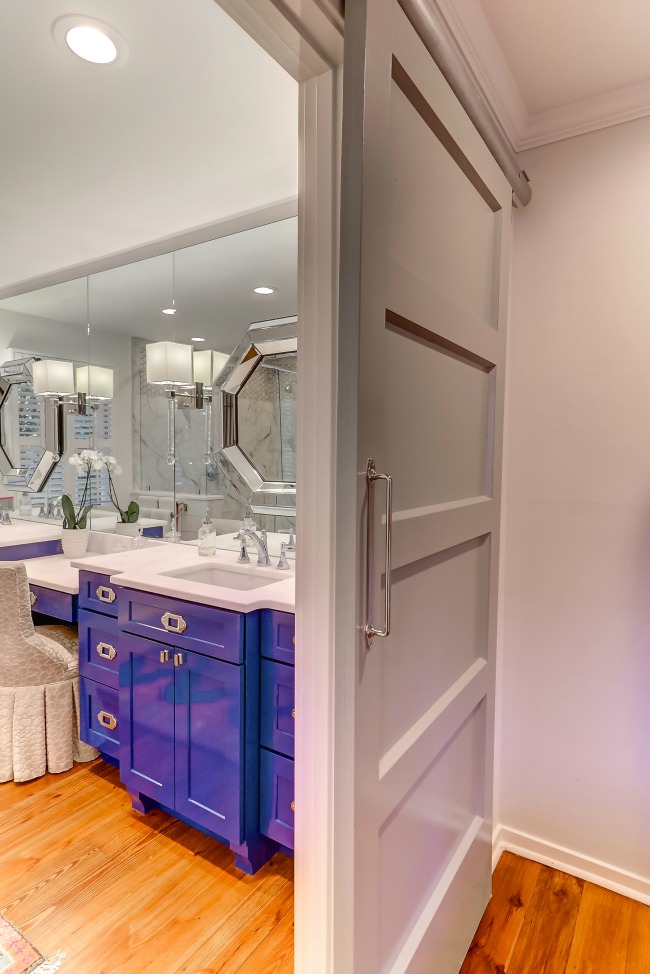 As a full master bathroom remodel, the end result is one of the most glamorous spaces I’ve designed. Long mirrors, chrome fixtures and the custom vanity painted blue create an elegant and attractive master bathroom. The custom barn doors invite you to step in and set the tone for the high-end space behind.